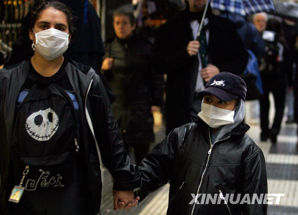 7月6日,两名行人戴着口罩行走在阿根廷首都布宜诺斯艾利斯街头。阿政府当天宣布,从即日起阿根廷诊断和治疗甲型H1N1流感将采取统一方法。阿根廷是甲型H1N1流感在南美地区的“重灾区”,甲型H1N1流感死亡病例已经增加到60例,确诊病例2485例。新华社发(马丁·萨巴拉摄)