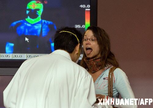 2009年5月5日 墨西哥已确诊甲型H1N1流感患者人数增至776人 5月4日,在墨西哥首都墨西哥城的贝尼托华雷斯国际机场,一名墨西哥乘客接受健康检查。墨西哥政府当日晚宣布,墨全国已确诊甲型H1N1流感患者人数776人,死亡26人。新华社/法新