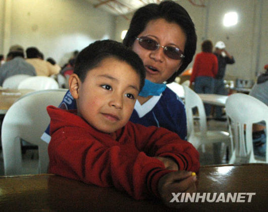 5月2日,墨西哥东部韦拉克鲁斯州男孩埃尔南德斯和母亲在政府临时搭建的免费食堂休息。墨西哥韦拉克鲁斯州的4岁男孩埃尔南德斯是墨西哥第一位被确诊感染甲型H1N1流感的患者。埃尔南德斯经过半个多月的治疗已经痊愈,恢复正常生活。 新华社发(卡拉加西亚摄)