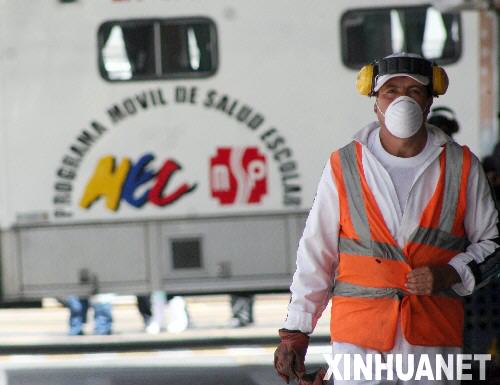 4月29日, 在厄瓜多尔首都基多苏克雷国际机场,一名机场工作人员戴着口罩上班。为防止感染猪流感病毒,机场要求所有工作人员戴口罩上班,同时,进出机场的旅客都将接受严格的身体检查。 新华社发(圣地亚哥·阿马斯摄)