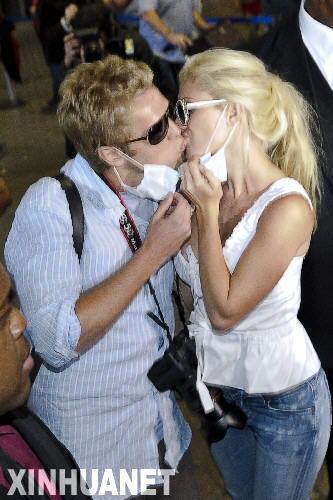 4月29日,刚刚在墨西哥度完蜜月的MTV明星海迪·蒙塔格(右)和斯潘塞·普拉特(左)抵达洛杉矶国际机场后摘掉口罩接吻。洛杉矶国际机场是美国至墨西哥的主要航空枢纽之一,由于受猪流感疫情的影响,来往洛杉矶和墨西哥的40多个航班的上座率有所降低。新华社记者戚恒摄