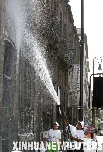 5月5日,在墨西哥首都墨西哥城,工作人员清洗建筑物外墙。世界卫生组织当日公布的最新数字显示,全球确诊的甲型H1N1流感病例已增至1490例,其中墨西哥822例。 新华社/路透