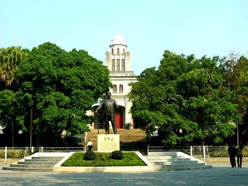 梧州中山纪念堂中国最早兴建的孙中山纪念堂是梧州中山纪念堂。位于梧州城区东北的中山公园北山上。1921年~1922年(民国10年~11年)孙中山曾3次到梧州从事革命活动,1925年孙中山逝世,梧州人民举行隆重的悼念仪式,李济深倡议在孙中山巡视过的北山顶兴建中山纪念堂。1926年奠基,1928年夏动工,1930年10月落成。主楼高约20米,建筑面积1630平方米。建筑平面呈“中”字形,分前、后座,采用中国古典宫殿式与罗马圆顶式相结合的建筑设计。前座中部为4层塔式圆顶楼建筑,正门镶嵌陈济棠题写的“中山纪念堂”匾。后座是会堂,会堂正面主席台上方塑有古铜色孙中山像浮雕和孙中山遗嘱全文,两侧有孙中山的“革命尚未成功,同志仍须努力”的遗训;堂内陈列着孙中山生平事迹,尤其是民主革命时期孙中山3次莅临梧州的史迹。1981年列为自治区级文物保护单位,1995年列为广西爱国主义教育基地。中山纪念堂前有草坪、荷池,周围有晨钟亭、北苑、动物园、西竺园等景点,绿树成荫,花团锦簇,环境优美,已成为旅游名胜。