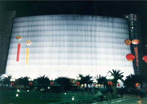 桂林“九天银河”瀑布“九天银河”瀑布建于桂林市中心广场南侧的漓江大瀑布饭店。2001年3月26日开工,2002年4月28日竣工。瀑布的巨大水流从饭店主体建筑12层楼顶奔泻而下,上部宽72米,下部宽74米,落水高度45米,水流成7度角倾斜,沿大楼玻璃幕墙流泻到饭店二层5.6米高处水池再跌入地面,水膜厚3.2厘米,水流量每小时2560立方米,气势磅礴,有“疑是银河落九天”之势。屋顶喷泉系统设36支带气喷嘴,二层水池喷雾系统设560支喷雾嘴,配备70支水下灯和14盏照明射灯,使“九天银河”瀑布景观在彩色灯光、喷泉、喷雾、音乐以及水幕流量变化的辅助下出现梦幻般效果,十分壮观。经上海大世界吉尼斯总部确认为世界上最大的人造瀑布。