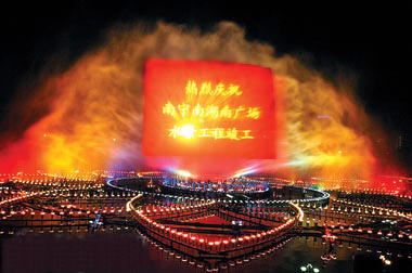 南宁南湖新城水幕电影综合水景是2003年南宁市“136”工程的重点项目之一,是中国表现形式最丰富、科技含量最高的大型综合水景工程,有规模最大的水幕投影、激光表演和大型音乐喷泉。通过水幕影像、艺术激光、三维动画、音乐喷泉、水雾影画、水中焰火和音响灯光特效等形式,营造出绚丽多姿、流光溢彩、似梦迷离、美轮美奂、海市蜃楼般的动态水幕幻景,是国际上最流行的集水幕电影、激光、音乐喷泉三位一体的高科技水景艺术项目。工程装机容量达2800KW,喷头达6620个,有8391盏水下彩灯,6盏射高1000米的彩色电脑遥控灯,电缆线总长282公里,喷泉布置总长度400米。设计有多种水形,整体造型为一个“人”字,体现以人为本的宗旨。喷泉水形主要有高达80米的主喷造型“世纪彩虹”、“万马奔腾”,俊秀的“朱槿花”、优雅的“海风抚琴”,国际首创运用航空航天高科技成果研制开发的“科技之星”、“金龙吐水”、“飞碟”,以及国内多种最新的自由变换水形。水幕电影全套设备采用美国最新的大型高流明投影仪和全色激光器,投射画面清晰逼真,能在水幕上制造出栩栩如生的动态彩色图案和3D动画效果,观众还可以在水幕上看到自己的影像,实现人与水幕的互动,尝试到一种全新的娱乐体验,领略到高科技和艺术、虚幻与真实、浪漫与激情的交织碰撞。