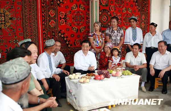 8月22日至25日,中共中央总书记、国家主席、中央军委主席胡锦涛在新疆考察工作,深入天山南北看望慰问各族干部群众。这是胡锦涛在阿克苏市良种场尤喀克桥格塔勒村村民亚森·吐尼亚孜家院子里,同维吾尔族、汉族乡亲亲切交谈,勉励大家共同建设团结和谐的美好家园。新华社记者鞠鹏摄