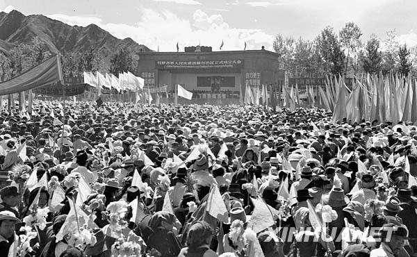 1965年9月,拉萨各界各族人民3万多人举行集会游行,热烈庆祝西藏自治区成立(资料照片)。