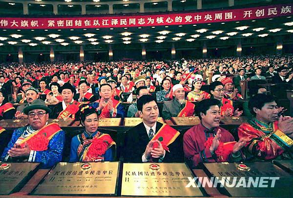 1999年9月29日,中央民族工作会议开幕式暨国务院第三次全国民族团结进步表彰大会在北京人民大会堂举行。1254个民族团结进步模范集体和个人受到表彰(资料照片)。