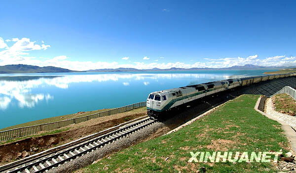 2006年7月20日,一列火车驶过藏北错那湖边。2006年7月1日,全程1142公里的青藏铁路开通(资料照片)。