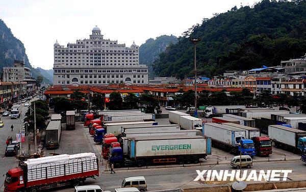 2008年11月19日,来自中国各地和越南的大型货车在广西凭祥口岸浦寨贸易区等待交易(资料照片)。
