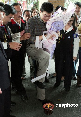邱毅从坐牢地点高雄到台北后,返回“立法院”,同党“立委”依习俗,安排跨火炉仪式,去霉气。