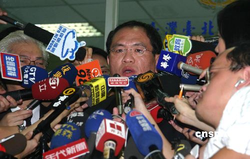 8月14日中午,在台北地方法院一审判决无罪后,前台北市长马英九在台北举行记者会,形容半年来他悲愤莫名,呼吁“虚耗到此为止”。图为他在记者会上偶尔露出笑容。当日上午,“特别费案”经台北地方法院一审,宣判马英九无罪。 中新社发 董会峰 摄