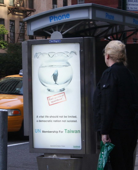 据台湾“中央社”报道,台湾今年首批“入联”广告27日傍晚在曼哈坦联合国总部周边电话亭挂了起来,从南到北、从西到东,总计二十幅。