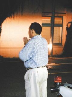 基隆巿小学四年级女童曹博涵疑上吊,其祖父在医院急诊室外对天祈求神明保佑。可惜医院回天乏术。(台湾《联合报》图片) |