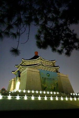 夜色下,“中正纪念堂”的匾额及两侧已被大型“台湾民主纪念馆”布幕遮住覆盖,大型的白色建筑体仿佛穿上绿色的小马甲,突兀而无助。