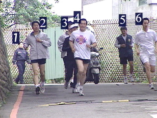 马英九从山坡上跑下来,民众报以热烈掌声,现在维安层级提升,最少六名随护陪着跑