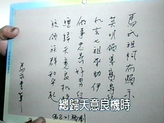 苗栗马家祠堂祭祖,宗亲拿出去年8月有人预测马英九会当选做的打油诗,横批刚好是“马英九做总统”。