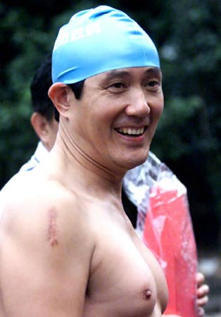 在泳池边上大秀胸肌马英九爱好运动,给人以身体健康的印象。