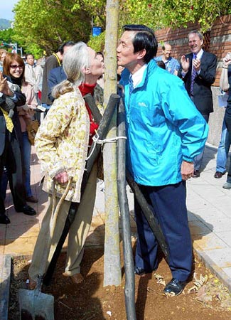 马英九与支持者隔着小树“接吻”,逗乐围观人群。马英九凭借俊朗的外形在台湾有“女性杀手”之称,常被疯狂的支持者拥抱。