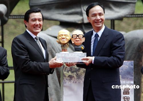 资料图:2008年4月5日,马英九为全台最大的蒋中正铜像举行再造重生揭幕,桃园县长朱立伦(右)赠与“两蒋”Q版公仔。 中新社发 杜洋 摄