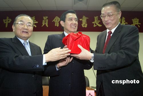 一月十二日上午,中国国民党中央委员会举行秘书长交接仪式,原任秘书长詹春柏(左)在国民党主席马英九的监督下,将印信交给新任秘书长吴敦义(右)。 中新社发 张炜 摄