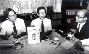 1989年10月5日,“美丽岛事件”十余位辩护律师陈水扁(左)、谢长廷(中)、苏贞昌(右)等重聚,商讨如何救援许信良。