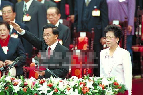 陈水扁在人前表现对夫人吴淑珍很体贴。