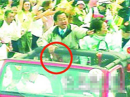 2004年3月19日,在台湾“大选”结果公布前夕,陈水扁遭枪击。腹部受伤。