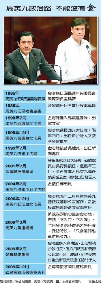 马英九和金溥聪结识于一九八五年,当时马担任国民党副秘书长,从“青辅会”留学生名单中录取了金,协助“洋务”工作,其后金也曾随马赴“研考会”任职。九七年,马决定投入台北市长选战,时任政大教授的金归队操盘文宣。近十年来,马英九在逐步攻顶的过程中,经历大小战役无数,马团队也不断调整队形,不管置身幕前抑或退居幕后,金溥聪始终是马身边不可或缺的“金脑袋”,广结五路英雄的重要媒介。