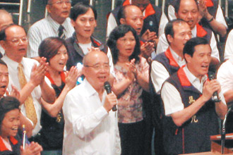 国民党主席唯一候选人马英九(右),与现任主席吴伯雄带动全场唱“团结力量大”。台湾《联合报》图片