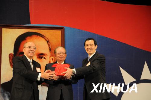 10月17日上午,马英九在台北举行的中国国民党第十八次全代会上正式接任国民党主席。这是马英九(右)从吴伯雄(左)手中接过国民党主席印信,完成党主席职务的交接。新华社记者陈斌华摄