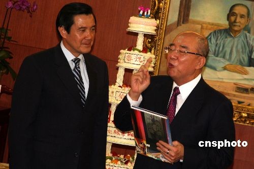 在70岁生日到来之际,中国国民党主席吴伯雄出版《感恩的心》一书。图为6月17日下午,吴伯雄(右)在国民党中央党部举行的庆生茶会上,向马英九赠送精选150张照片、数万文字的新书。 中新社发 董会峰 摄
