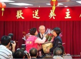 国民党第18次全代会即将于本周六(17日)登场,新旧主席将进行交接,国民党14日下午特别为将卸任的党主席吴伯雄举办欢送茶会,国民党“立委”杨琼璎在茶会上献花并献吻。来源:台湾“今日新闻网”