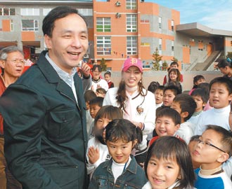 桃园县长朱立伦跑行程很有效率,迅速解决疑难杂症。一群小学生包围他,谢谢县长帮他们盖图书馆与棒球场。