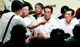 马英九(右一)、“农委会主委”陈武雄(右二)与小林村灾民座谈,说明将建组合屋及永久房屋安置灾民。图片来源:台湾《联合报》