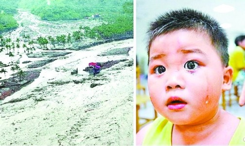 合成图:左为惨遭埋村的小林村,右为小林村男童获救后,因想念未脱困的父母,不断落泪。图片来源:台湾《苹果日报》