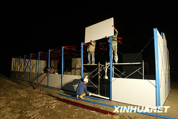 8月20日,大陆援助台湾台风“莫拉克”灾区的首批活动板房已运抵受灾严重的屏东县佳冬乡,当地工作人员已开始试装工作。新华社发