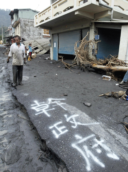 高雄县茂林乡里面的村庄全部对外交通中断,当地民众要外出或是返家都要冒险走溪床才能回家,有灾民不满高雄县政府救灾速度太慢,在满目疮痍的街道上喷上不满的字眼,表达心中不满。图片来源:台湾《联合晚报》