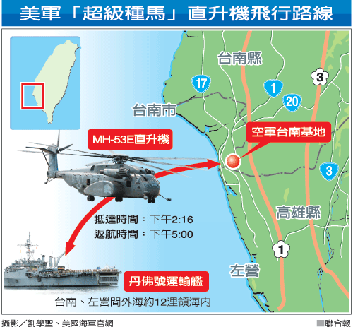 美军第一架MH-53E直升机昨天下午飞抵台军的台南军用机场,一个美方协调小组随机抵达,进行先期救灾协调工作,预定今天正式展开行动。AIT新闻科长万德福指出,因考虑后勤、维修等因素,美军直升机在台湾内部执行救援任务后都将飞返“丹佛号”,不停留过夜。