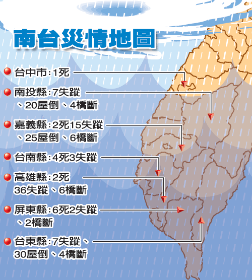 台湾著名的知本温泉几乎全毁,有22年历史的金帅饭店,应声倒入知本溪混浊激流中;连络高雄屏东的双园大桥,断成两截,至少有3车4人坠溪失踪。
