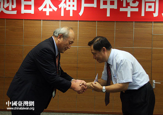 8月25日晚,日本神户中华同文学校修学旅行团通过全国台联向台湾南部灾区捐款约5万元人民币。图为全国人大常委、全国台联会长梁国扬(右)从修学旅行团带队老师手中接过捐款,并表示感谢。(中国台湾网 钟宝华 摄)