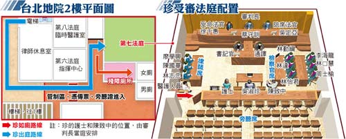 地检署规划,吴淑珍在下午2点20分能从地检署门口下车,在搭乘法警室旁边的电梯,直接进到第七法庭。