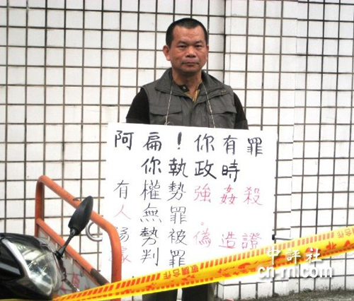 陈水扁委任律师郑文龙在接受记者访问时,一位反扁的老伯伯在一旁不停高喊“枪毙陈水扁”,引来警察的注意。警察随后劝离这位老先生,老先生还从包包里掏出准备好的反扁布条,引起一阵小小的骚动。