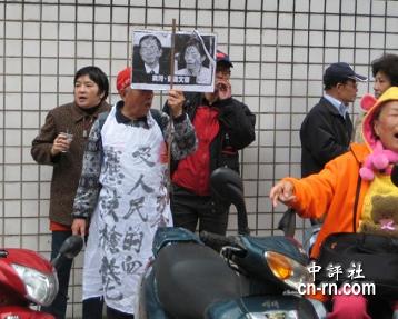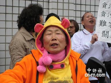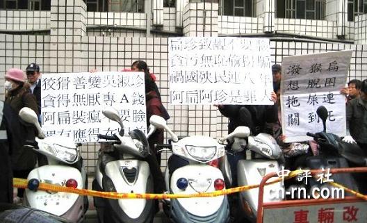 据中评社报道,台北地方法院今天起一连三天开庭审理扁家弊案,被告吴淑珍下午坐着轮椅出庭。法院外呛扁群众虽然只有10余人,但都有备而来,有人穿猪头装、有人自制白色围兜、拿扁珍照片,还有人高举大字报呛扁珍,十分投入。