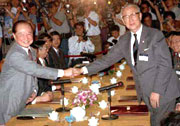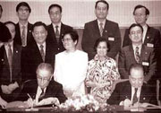 "海峡交流基金会"("海基会")于1990年11月21日成立,1991年3月9日举行开幕式,正式挂牌运行。该会分设由43人组成的董事会和由6人组成的监事会;"总统府资政"孙运璇为名誉董事长;国民党中常委、台湾工商协进会会长辜振甫任董事长;国民党中常委、台湾工业总会理事长许胜发和台湾红十字会秘书长,"国防部"法律顾问陈长文为副董事长兼秘书长,该会内设秘书处,文化服务处、经贸服务处、旅行服务处及综合服务处等6个业务单位,主要功能是接受"陆委会"委托,办理两岸交流所衍生的各项事务。 |