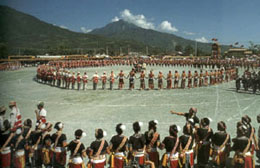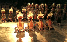 欢庆小米丰收的丰年祭阿美族的传统祭典很多,但以一年一度的丰年祭规模最大,这是族人为了欢庆小米丰收、祭祀神灵祖先所举行的祭典,并负有教育男子成年、承传薪火的慎重意义;部分部落并借着递送槟榔、“牵手礼”等活动,撮合适婚男女。从前阿美族人的主食是小米,祭典的时机也配合小米的收成;如今则改以稻米的收割季节,台东地区约在7月份,花莲地区则多在8月举行。一个完整的丰年祭包含了“迎灵”、“宴灵”和“送灵”三个阶段,之前之后都要举行捕鱼仪式;不过在基督教传入及社会变迁等诸多因素的冲击下,缩短日期、简化宗教仪式已成了共同的趋势,取而代之的是融入了相扑、拔河等竞技,甚至结合木雕、工艺的展示及美食巡礼,成为上下同欢的歌舞“嘉年华”,也是外人认识阿美文化的窗口。改良过后的丰年祭,由于深具节庆性质,因此更适合一般游客参观、同乐。每个部落举办的丰年祭各有特色,短则1天,长则7天;之前的准备布置工作让部落里的人都忙了起来,家家户户酿制小米酒、糯米酒以飨宾客,并在社区活动中心或学校运动场架起守望台;活动期间,除了各项祭典、歌舞活动外,甚至融入拔河、赛跑、相扑、射箭等竞技比赛,整个部落为之沸腾。 歌舞活动是丰年祭重要的一环,也是时代演变下,族人无论如何不会废去的项目,因为它不但具有祭仪的意义,更是族人同欢同乐的社交活动。阿美族丰年祭歌舞有分男性专属、女性专属及男女合舞,各运用在不同场合;其中年轻男子担纲的“勇士舞”,是以大幅度肢体摆荡,表现出齐一的战斗性,非常具有震撼性。其歌唱由长者发音,众人应和,如此不断反复,而众人也手牵着手围成圆圈,面向圆心作逆时针的进行。各部落均有其独特传唱歌舞,然而由于平时不得练唱,又禁止向其他部落学习,因此流失情形相当严重,目前以大港口、宜湾、奇美、马兰、都兰等地的歌舞保存较为完整。也有若干部落,至今仍坚持传统仪式,并按“年龄阶级”运作不辍。这些部落大多位在沿海或山区,如丰滨、大港口、胆曼、白桑安、宜湾、奇美等,由于地理较孤立,反而成为维系阿美文化的中流砥柱。 以奇美为例,丰年祭一共持续5天,旅居外地的族人均会返回部落,共襄盛会。头两天可以算是准备期,首日要向外“报信息”,宣告活动开始;接着第二天,青年们上山采回黄藤等野菜,准备成丰盛的午餐,邀全村男性一起享用,而长辈也借此机会,教育年轻人团结合作的重要。第三天晚上,全村男子共舞迎灵,祭典正式揭幕,一般来说,迎灵的活动比较严肃,外人也较不便参与;之后两天的白天,青年组的组员将前往级友家“巡访”,夜间举行的宴灵、送灵歌舞,亦加入了女性的歌舞,欢乐气氛逐渐展开。尤其最后一天更是年祭的高潮,族人热情邀请宾客加入圆圈共舞,傍晚时会举行盛大的“辦桌”,用槟榔叶鞘盛满丰富菜色,所有来宾皆可与族人共享美酒佳肴。