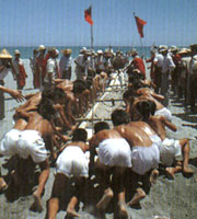 遥拜祖先与亡灵——捕鱼祭?舟祭捕鱼祭是阿美族另一项重要的仪式,起源于阿美祖先乃从海上漂流到东海岸,为感谢海神一路护佑、并得以繁衍子孙而举行。这项盛典多于6、7月收割季来临前举行,祭拜海神、祖先与海上亡魂,并祈求渔货丰收;而丰年祭的活动,往往也以捕鱼作为开始和结束。捕鱼是男人的责任,对阿美族人来说不仅是经济活动,更是重要的仪式和文化传承。以年龄划分阶级的阿美族人,从捕鱼一事中建立长幼生活经验传递,并教导少辈了解及尊重自然生物,男性也从中强化自身对家庭的责任。捕鱼祭传统上多选择望日举行,因为在月光照耀下,捕鱼工作进行较顺利;如今祭典多改到白天,并且为了提高族人参与率,通常会安排在周末假期。捕鱼祭限男性参与,开始时先以巫师用酒喷过的槟榔叶镇邪驱魔,并进行拔河比赛,接着进行渔捞;男子们带着渔网、渔具及祭品,居住在海滨者驾着船筏下水,内陆地的族人则将溪流围堵起来;待渔获上岸后便在岸边就地烹煮,并与宾客一起分享。随着台湾溪流鱼类逐渐减少,捕鱼祭有的改成两年一次,有的到市场购买放进水中因应祭典,尽管如此,阿美族人至今对捕鱼一事仍然虔诚。 除了丰年祭、捕鱼祭外,位于吉安乡的东昌部落(里漏社)则有一项独特的“舟祭”。部落里保存着据说是阿美族始祖登陆上岸时所搭乘的独木舟板,为纪念祖先渡海来台,每隔8年,村民都会举行一次独木舟下水祭。在此之前,部落会为届龄的青年男子举办成年仪式,通过为期约2周的技能训练、礼仪学习,最后再经过“马龙龙”(3000公尺长跑)的考验,之后正式步入成年,成为被族人许可的勇士,并参加下一阶段的独木舟下水祭。