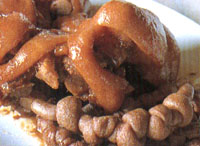 平交道旁的小店像个家庭伙食堂,身为客家人,满婆婆做出来的卤味颇有客家菜咸、香、油的特色,其中招牌的卤猪脚系先炸后卤,皮滑肉嫩;而卤结肠则是一串肠结,乃为在炖卤过程保持肠中津液。可口的卤味配上白饭,可让人不知不觉添上好几碗。
