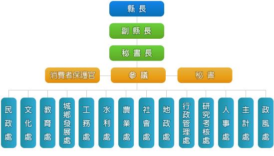 本府置秘书长一人,为幕僚长,承县长之命,处理县政。置参议、秘书、消费者保护官,受秘书长指挥、监督,掌理机要、动员、协调、核稿、消费者保护争议调解等事项。