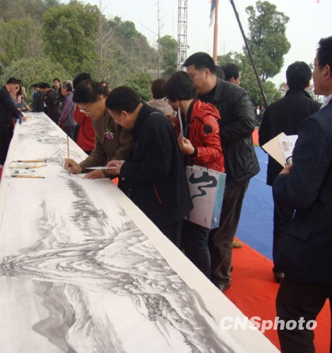 3月20日,在《富春山居图》原创地浙江杭州富阳市,来自台湾的山水画家林进忠、蔡友与大陆的冯远、孙永等6名山水画家在15米长卷上共同临摹《富春山居图》,并发出真迹“合璧”的邀约。中新社发 柴燕菲 摄